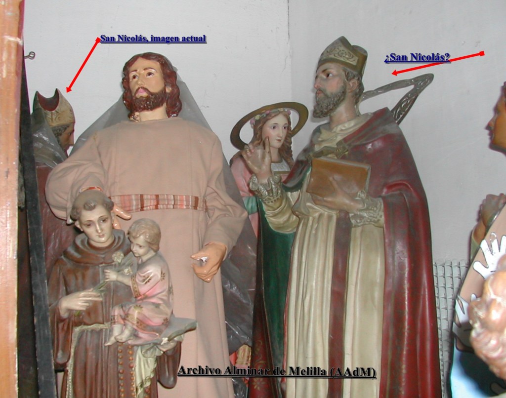 ¿Qué ocurrió en Melilla con San Nicolás? La etapa iconoclasta (1974-1988), lo barrió del mapa de los altares.  Incluso en la iglesia de la Medalla Milagrosa se emparedó su altar. La imagen quedó, pero encerrada en un cuarto. ¿Cuántas imágenes había? Expertos dan una cifra de al menos 4. Hay tres visibles y registradas. Una de ellas estaba en la famosa «mazmorra de los santos», apiladas junto a otras, de la parroquia del Real. De allí fue sacada y puesta de nuevo a la visión de los fieles. La recuperación del culto es otra cosa. Faltaría una, y no hay indicios de que aparezca, o quizá sí esté.