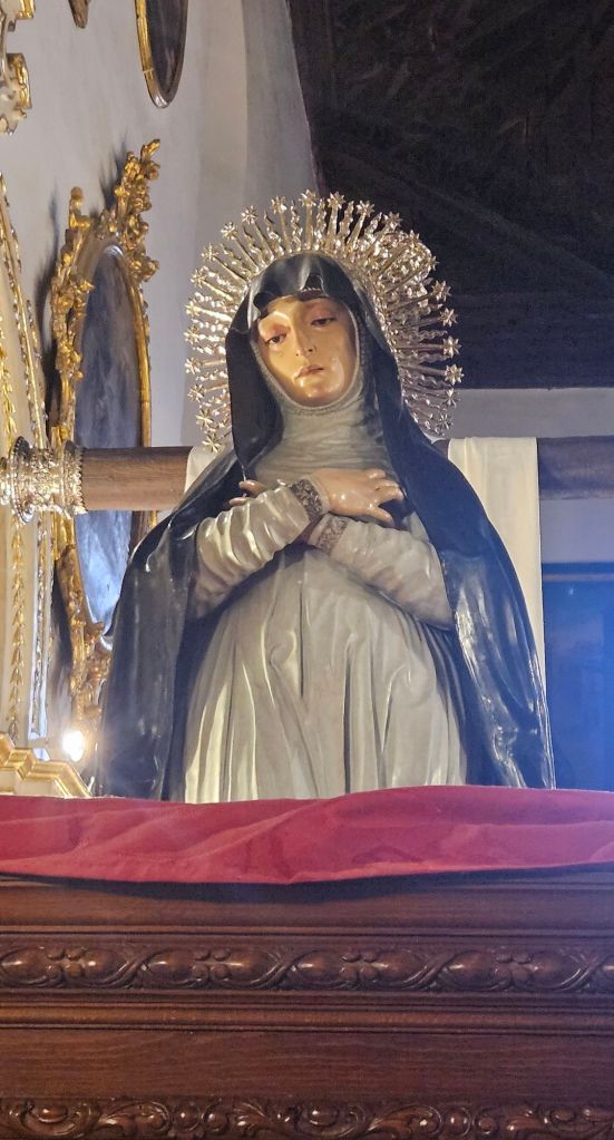 En esta ocasión, pudimos entrar en iglesias muy conocidas, pero que permanecen casi siempre cerradas, salvo en horarios de culto, como las de San Pedro, y la Santa Ana, y otra menos conocida por el gran público, la del Corpus Christi (Hospitalicos) en donde observamos algunas tallas de aspecto hipnótico, de esas que parecen mirar. Una «Dolorosa» y unos bustos en la entrada llamaban poderosamente la atención, además del aspecto diáfano de la nave central. Un espacio reducido, que parece más grande por su diseño. En realidad es una antigua capilla de un hospital, de ahí su sobrenombre. Esa «dolorosa», protegida por una urna de cristal, tiene una expresión tensa y notable de dolor, pero sin llegar a la carga expresiva del Barroco. Resulta llamativa, al igual que el resto de la nave. Se trata de una figura muy estilizada, con rasgos de hieratismo y aflicción contenida.